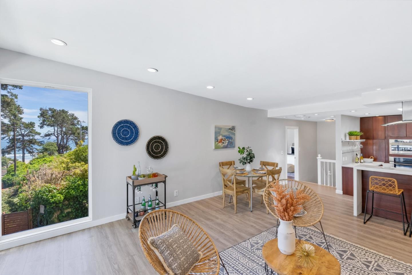 White water coastal views and a short stroll to Hidden Beach playground and beach access. Tucked at the corner of a desirable Rio Del Mar neighborhood and raised above the street for additional privacy this beach home is the perfect oasis. Floating concrete steps and walls with overflowing plants lead to flagstone and lawn areas with custom curved metal raised planting beds and Ipe wood bench seating with storage. The home has been extensively updated throughout with modern touches. The downstairs entry has a sitting room with fireplace and 2 bedroom suites each with their own beautifully remodeled bath including one with a high tech steam shower. The upstairs offers another bedroom suite with ocean views and a modern kitchen that opens to an additional sitting room with coastal views from inside and outside on the deck. Easy indoor and outdoor access makes this the perfect spot to enjoy the beach life.